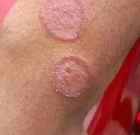 Les cellules s’accumulent alors à la surface, formant des plaques épaisses, rouges et recouvertes de squames blanchâtres. Ces plaques peuvent apparaître n’importe où sur le corps, mais touchent souvent les coudes, les genoux, le cuir chevelu et le bas du dos.