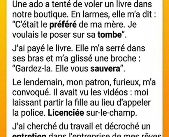 Quelques jours plus tard, un détail est revenu à mon esprit : une petite broche offerte en guise de remerciement. L’adolescente me l’avait donnée avant de partir, presque honteuse, en me disant : « C’est à ma mère. Elle aimait ce bijou. Je veux que vous l’ayez. »