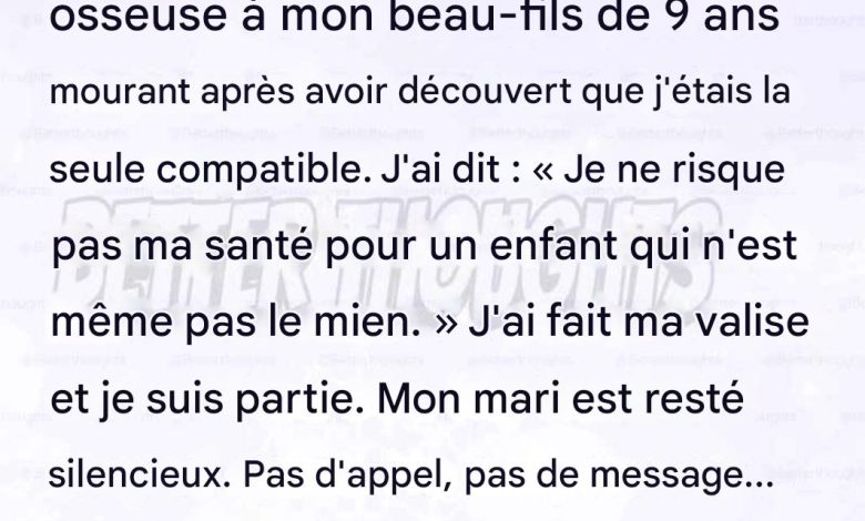 À l’époque, je me persuadais que cette logique tenait la route. Le don de moelle osseuse n’était pas anodin. Il y avait des risques, des complications et une période de convalescence. Je me répétais que je connaissais à peine ce garçon quand j’avais épousé son père. Je n’avais pas été là pour son enfance, ses premiers pas, son premier jour d’école. Pourquoi devrais-je me sacrifier pour un enfant qui n’était pas vraiment le mien ?