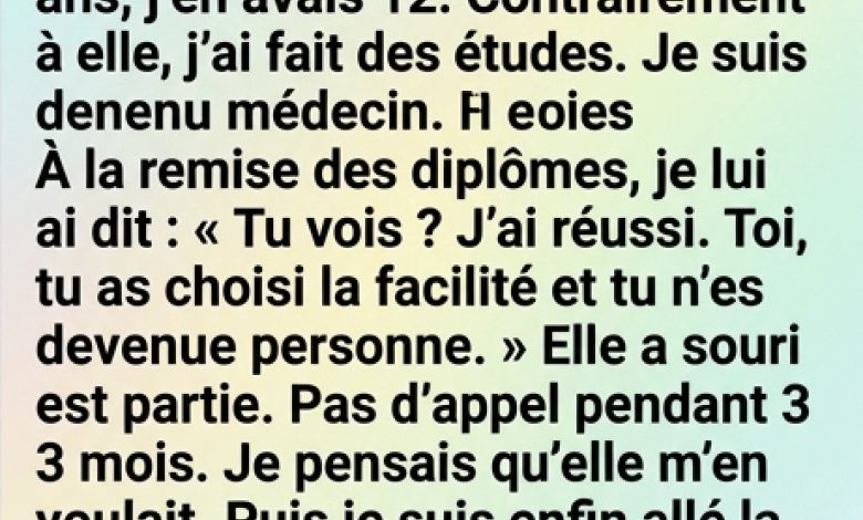 Sur le moment, cela ne me semblait être qu’une phrase lancée sans réfléchir, emportée par l’émotion d’une journée inoubliable. Il y avait les applaudissements, les sourires, la fierté d’avoir enfin atteint un objectif tant attendu. Tout le monde célébrait ma réussite, et au fond de la salle, ma sœur applaudissait discrètement, avec cette tendresse silencieuse qu’elle avait toujours eue. Mais ce jour-là, quelques mots prononcés trop vite ont laissé une trace bien plus profonde que je ne l’imaginais. Ce n’est que des années plus tard que j’ai compris à quel point j’avais sous-estimé celle qui avait toujours veillé sur moi dans l’ombre. Aujourd’hui, je veux partager cette histoire pour vous inviter à réfléchir aux relations qui comptent vraiment, avant qu’il ne soit trop tard.