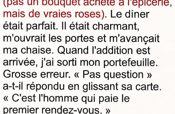 Mais Éric a insisté. Vraiment insisté. “Un homme paie au premier rendez-vous”, a-t-il déclaré, d’un ton qui ne semblait pas laisser de place à la discussion.