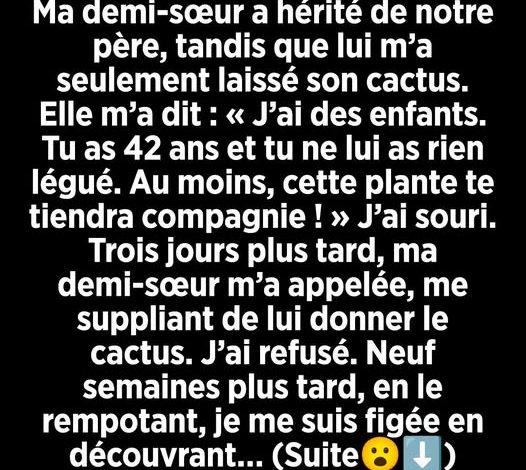 Quelques jours plus tard, ma demi-sœur m’a appelée. Elle voulait récupérer le cactus. Après tout, ce n’était « qu’une plante ». J’ai refusé, calmement. Pas par esprit de revanche, mais parce que je sentais que ce lien m’appartenait désormais. Ce refus a créé une tension, mais je savais, au fond de moi, que j’avais raison. Ce cactus n’était pas un simple objet de décoration ; il était le dépositaire d’un message que mon père avait voulu me transmettre en secret.