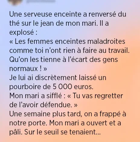Je pensais que cette histoire s’arrêterait là. Une mauvaise soirée, un incident oublié. Mais une semaine plus tard, on a frappé à notre porte. En ouvrant, j’ai immédiatement reconnu la serveuse. Elle avait encore ses cernes, mais son visage était plus détendu. Elle n’était pas seule.